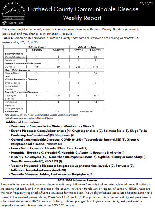 This report provides the weekly report of communicable diseases in Flathead County. The data provided is provisional and may change as information is received.