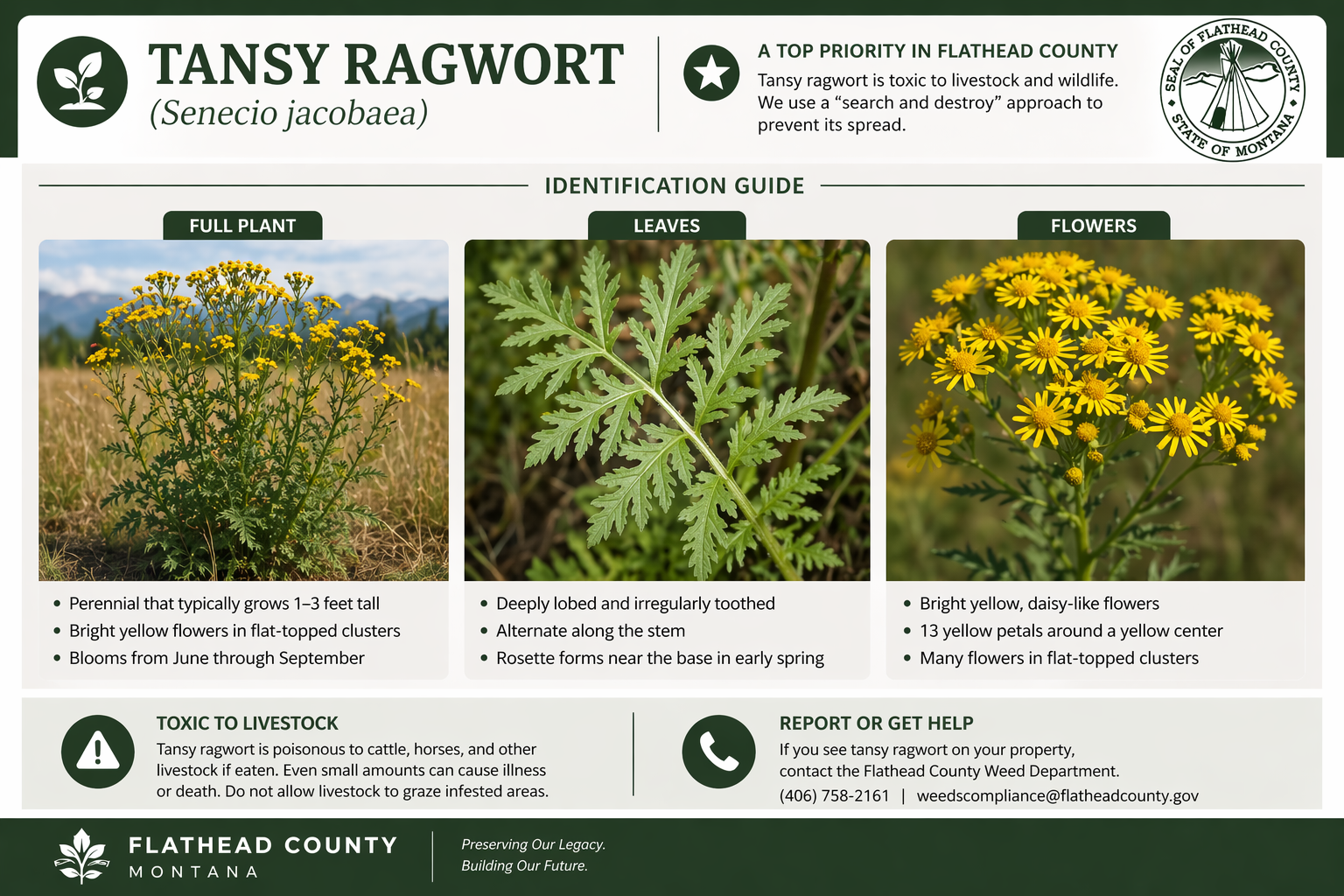 Tansy ragwort is a toxic invasive plant commonly found in pastures, roadsides, and disturbed areas. It is a high-priority species in Flathead County.