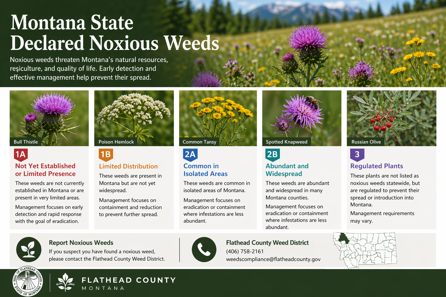 These weeds are abundant and widespread in many Montana counties. Management focuses on eradication or containment where infestations are less abundant, with local weed districts prioritizing response based on local conditions.